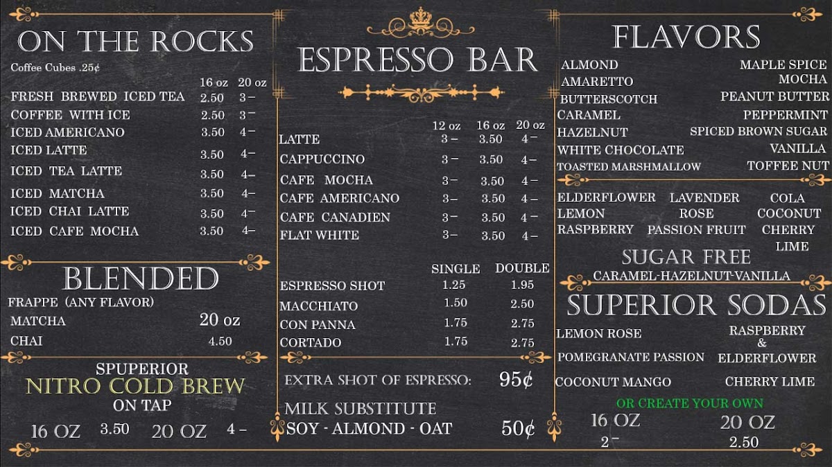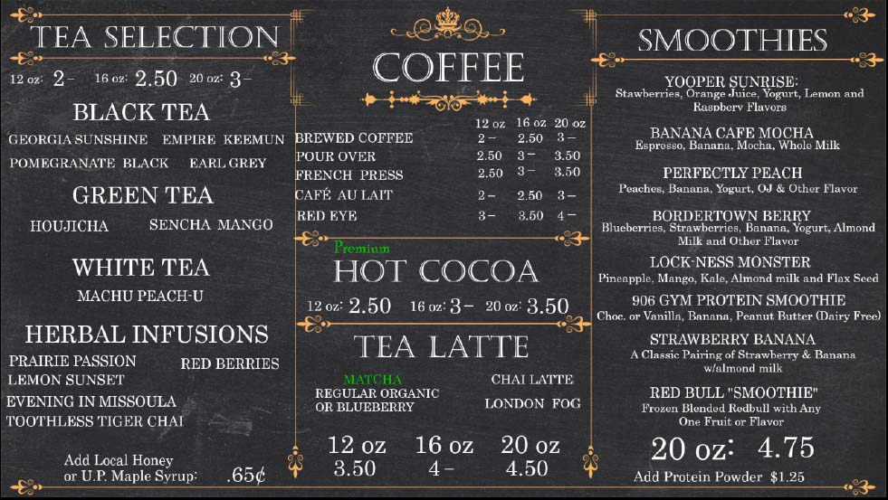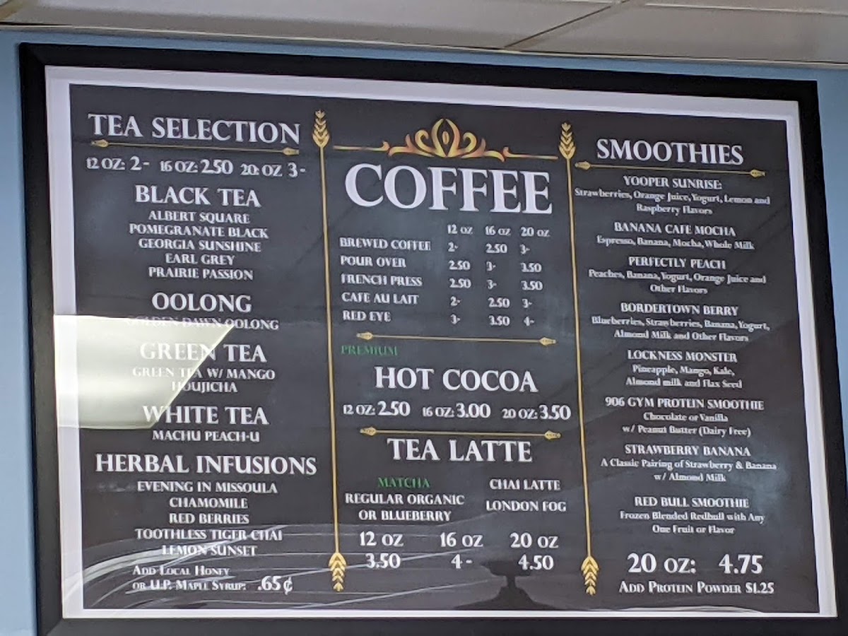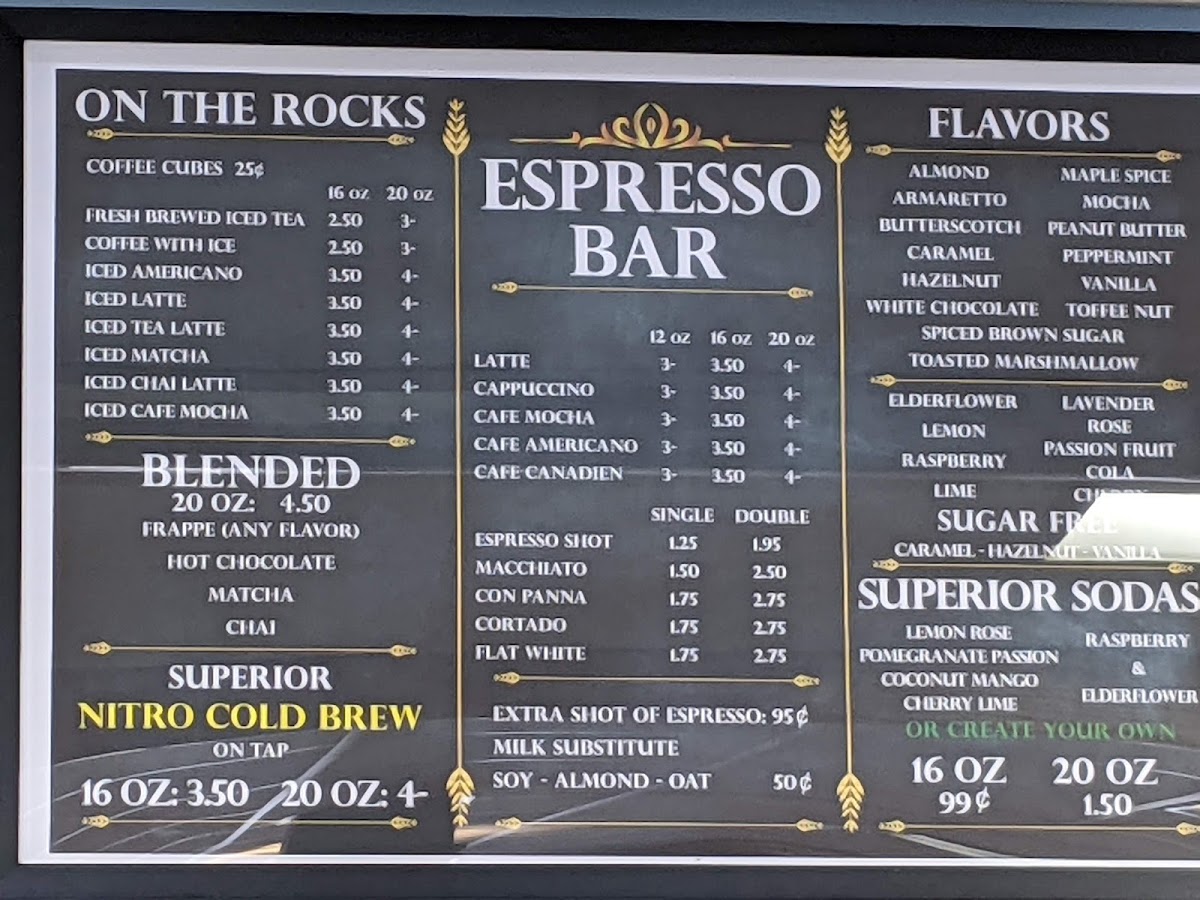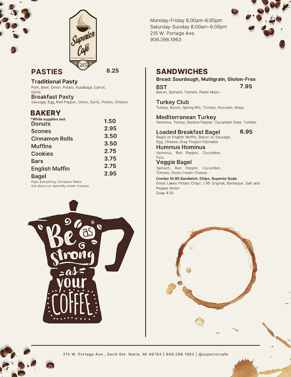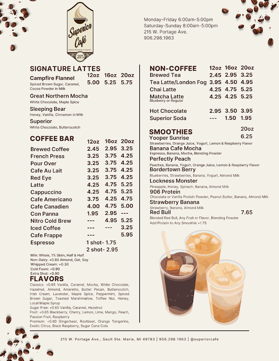 Welcome to Superior Cafe, an inviting gem located at 215 W Portage Ave in Sault Ste. Marie, MI. This contemporary cafe offers a delightful escape with its vibrant atmosphere and friendly service. The menu is nothing short of impressive, featuring signature lattes like the Campfire Flannel and the heavenly Great Northern Mocha. For those craving something refreshing, their smoothie selection shines with options such as Yooper Sunrise and Bordertown Berry.